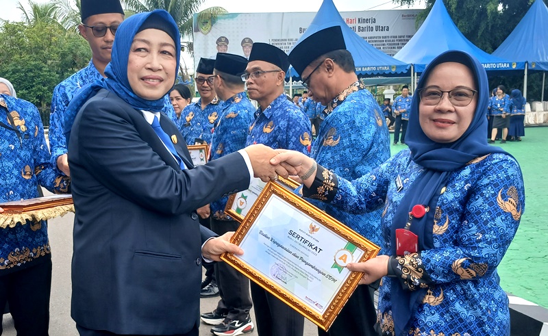 Piagam penghargaan diserahkan langsung oleh Bupati Barito Utara H. Shahaluddin usai Upacara HUT ke-54 Korpri di halaman Kantor Bupati, Senin (1/12/2025). Prosesi tersebut juga disaksikan oleh Ketua DPRD Hj Mery Rukaini.