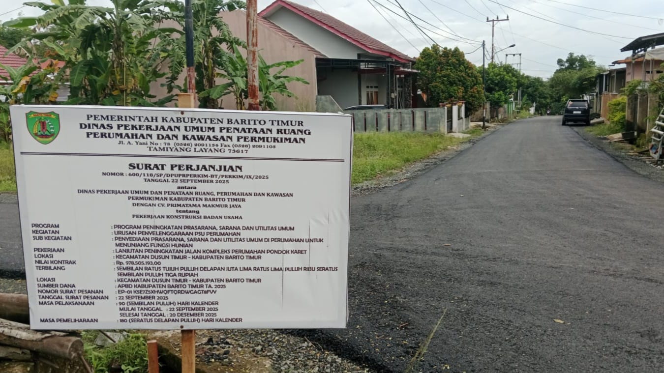 Untuk diketahui program kegiatan peningkatan prasarana, sarana dan utilitas umum yang berada di kompleks Perumahan Pondok Karet, Kecamatan Dusun Timur, kabupaten Barito Timur dengan anggaran sebesar Rp. 978.505.193,00 Rupiah yang di kerjakan oleh CV Primatama Makmur Jaya dengan batas waktu pengerjaan 90 hari Kalender. (B)