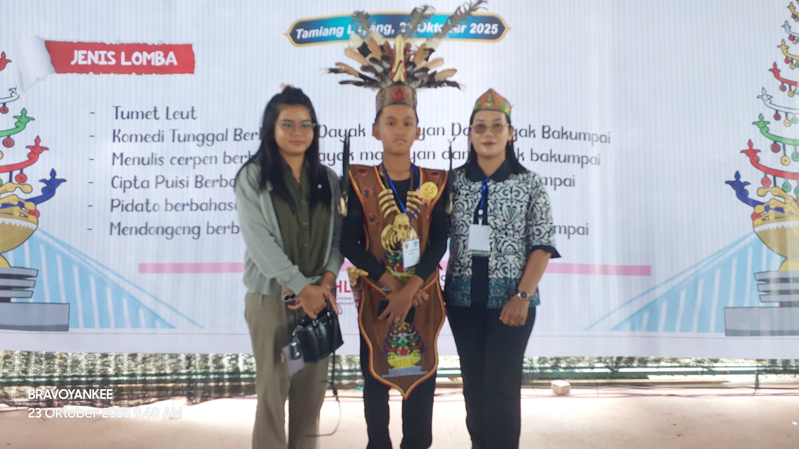 Tamiang Layang (METROKALTENG.ID) – Dengan mempertahankan adat budaya dan terus melestarikan ke generasi penerus, Salah satu murid Sekolah Menengah Pertama Negeri (SMPN) 4 Tamiang Layang, Revhal Ngampet Malem Ikuti Festival Tunas Bahasa Ibu (FTBI) yang di gelar Dinas Pendidikan kabupaten Barito Timur, di Ruang Terbuka Hijau (RTH) Kamis (23/10/25).